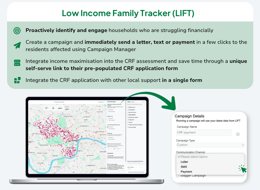 In practice, this allows authorities to invest in tools such as LIFT that support effective targeting, joined up delivery and monitoring of the Crisis and Resilience Fund. Administration spend will be published on GOV.UK alongside overall CRF spending and volumes.