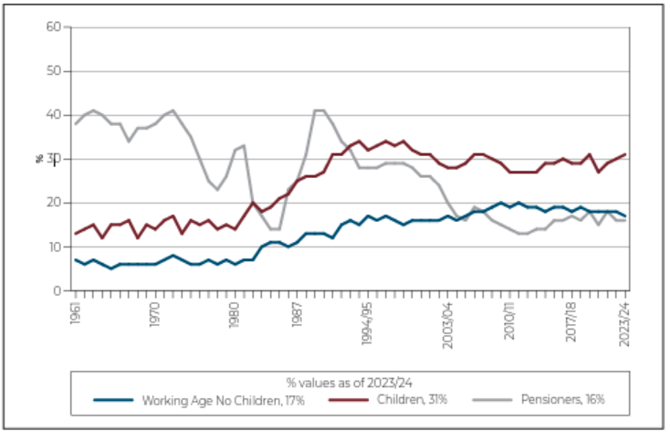 Relative low income (AHC) rate by age group 1960 to 2023/24 in Great Britain (Source: Our Children, Our Future: tackling Child Poverty, UK Government 2025)